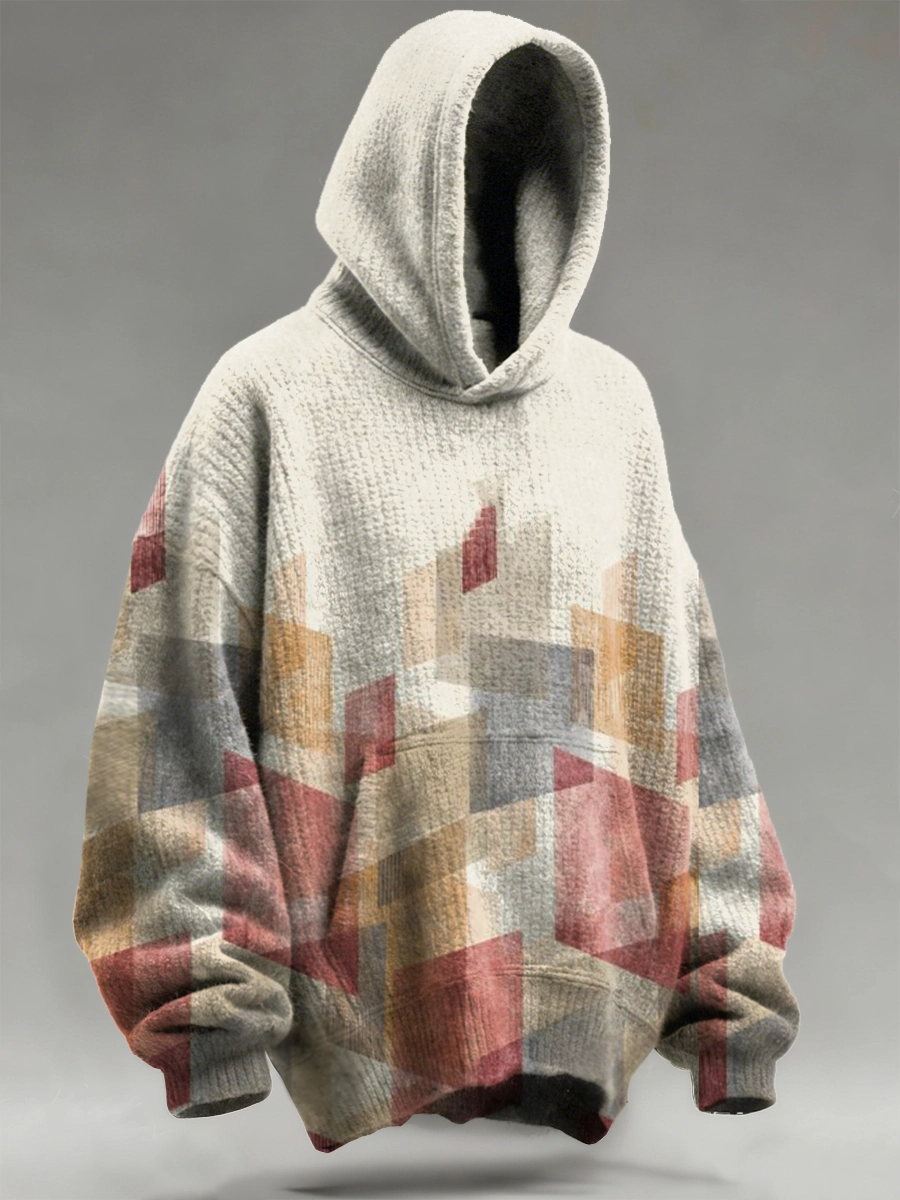 Retro Abstract Color Irregular Geometry Art Print Knit Pullover Hooded Sweater