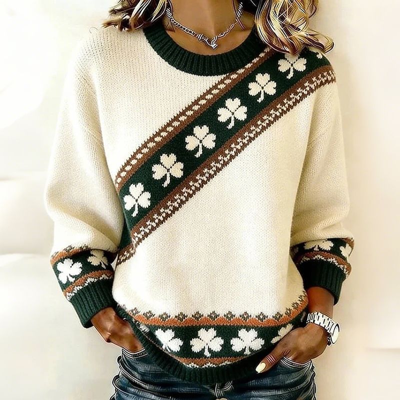 Saint Patrick's Day Retro Stripes Clover Print Knit Pullover Sweater