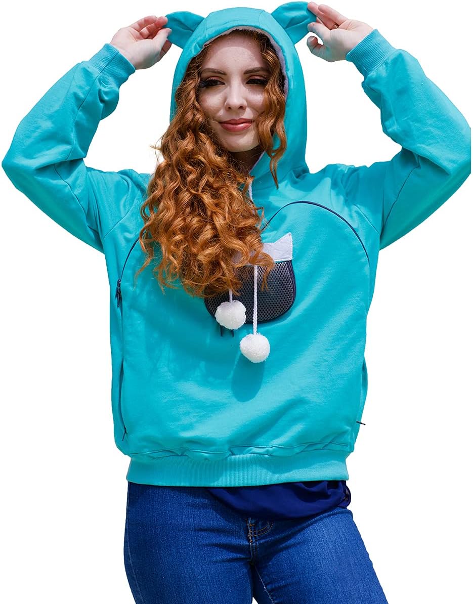 Womens Hoodie with Dog Pouch Fuzzy Fleece Kitten Cat Puppy Holder Kangaroo Pocket Pet Carrier Pullover Sweatshirts