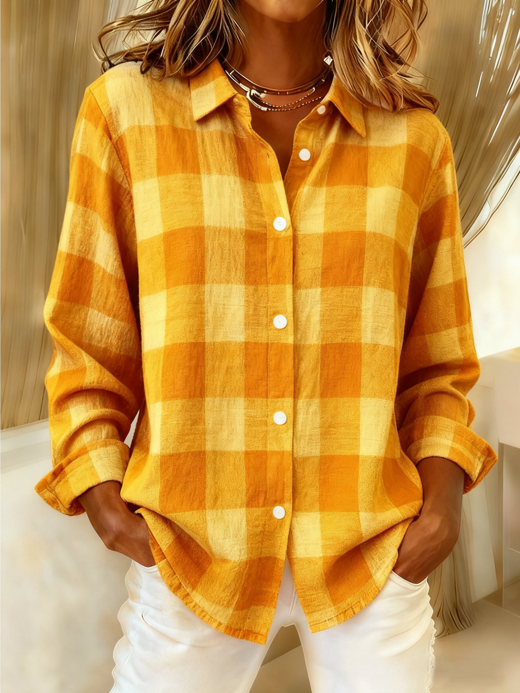 Women's Autumn Casual Yellow Plaid Print Lapel Long Sleeve Shirt