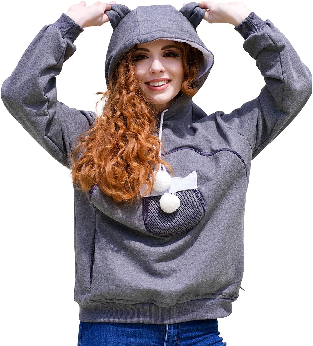 ALYC Unisex Hoodies Pet Holder Cat Dog Kangaroo Pouch Carries Pullover with Cat Printing Sweatshirt (Light Grey, XXL)