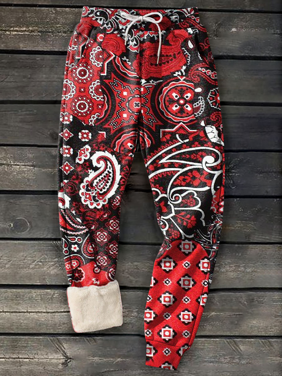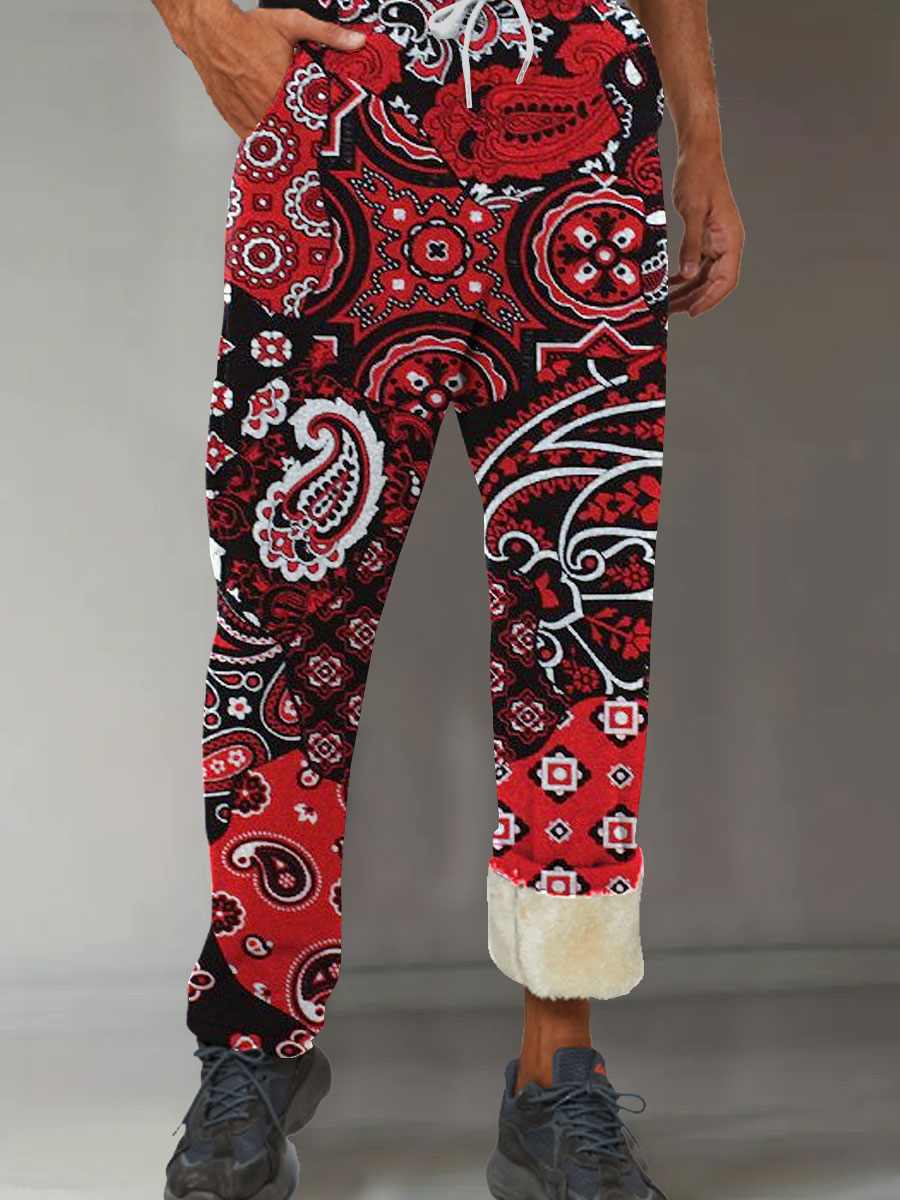 Men's Red Paisley Art Print Casual Winter Fleece Comfy Pants