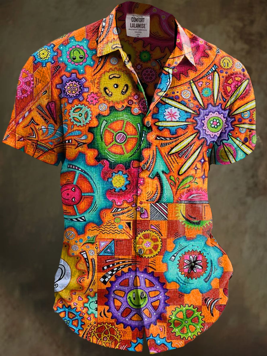 HandPainted Doodle Gears Art Print Casual Cotton And Linen Shirt