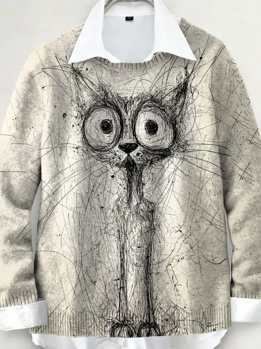 Simple Sketch Art Cat Fun Abstract Art Print Knit Pullover Sweater
